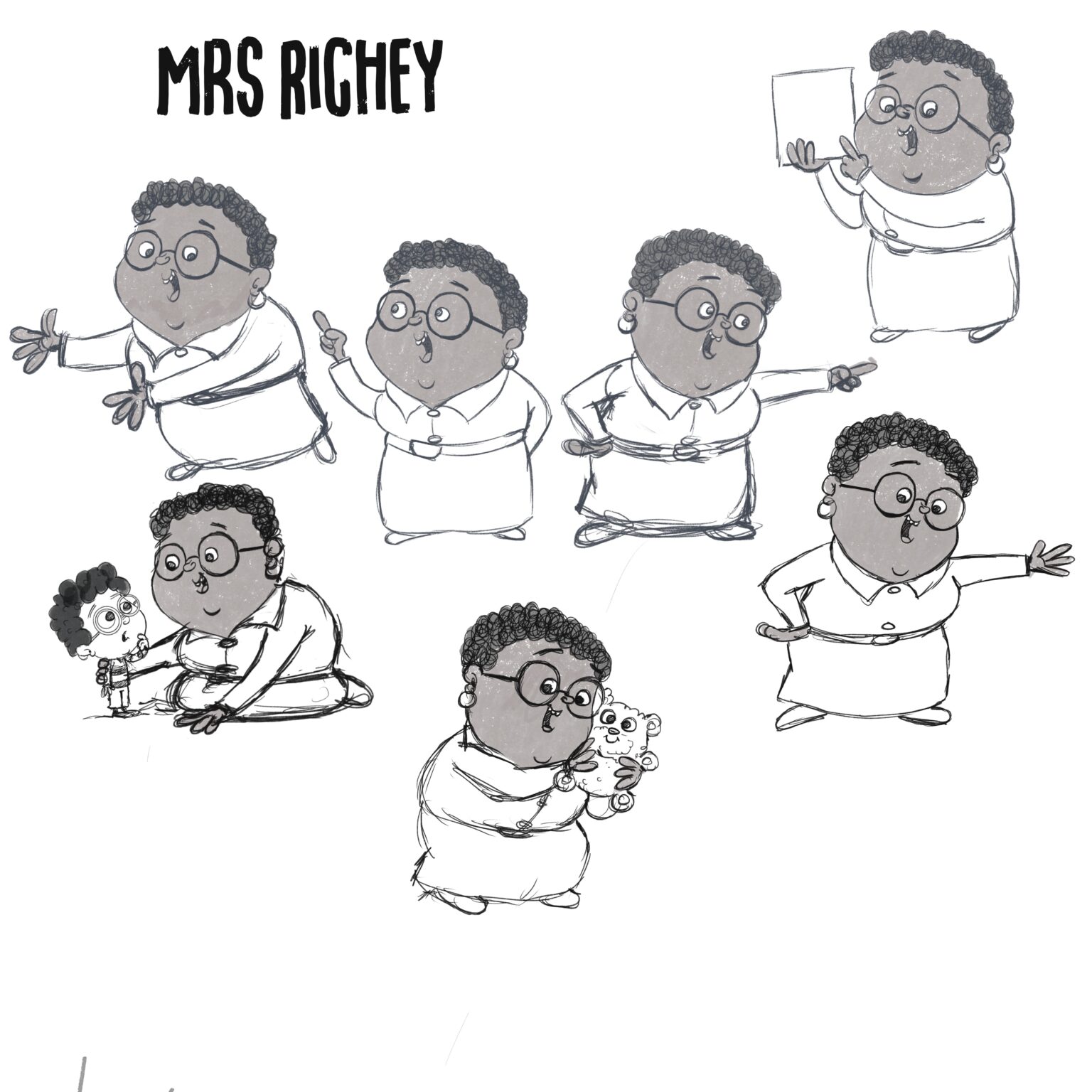 Once we're settled on the main character, we'll repeat the process for the others as well. Once all the characters are done, that's when I'll start creating model sheets with the characters in different poses. This helps me get used to drawing them at different angles and really helps bring the characters to life.